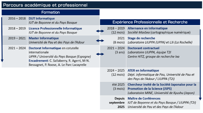- Doctorat en Informatique, Université de Pau et des Pays de l'Adour (2024)