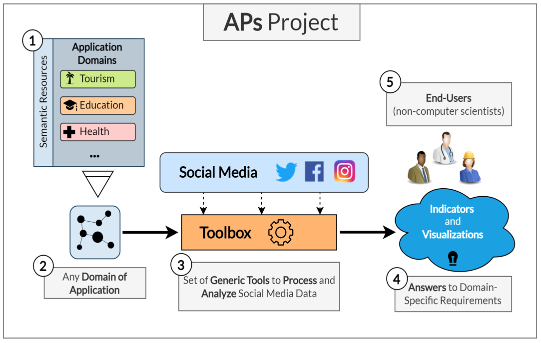 - Contrairement aux approches existantes, ce cadre de travail doit être adaptable à différents domaines d'application et indépendant de sources de données spécifiques. Les résultats doivent être exploitables par des utilisateurs non-spécialistes en informatique, comme les parties prenantes de chaque domaine (par exemple les offices de tourisme dans le domaine du tourisme).