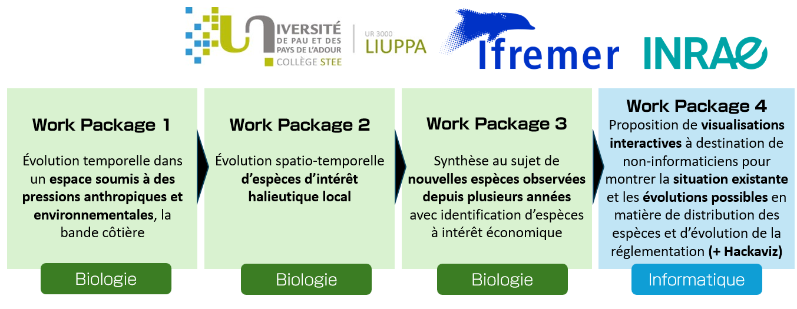 - Objectif : développer des représentations visuelles innovantes décrivant la situation actuelle de la biodiversité marine dans le Golfe de Gascogne, les tendances futures en termes de distribution des espèces, et les évolutions potentielles des réglementations associées (collaboration avec des biologistes de l'IFREMER et l'INRAE).