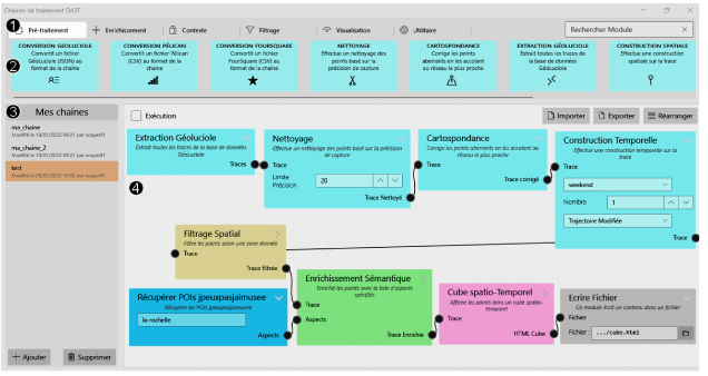 - J'ai conçu et mis en œuvre une plateforme ETL (Extract, Transform, Load) dédiée au traitement des traces de mobilité. Il s'agit de l'une des premières plateformes ETL spécifiquement orientées vers la mobilité. Elle permet une analyse simple de traces de mobilité hétérogènes issues de diverses sources et offre aux géographes la possibilité d'intégrer automatiquement (par exemple : traitement, enrichissement, visualisation) de nombreuses traces via des chaînes de traitement modulaires et réactives construites graphiquement. Cette plateforme est accessible à des utilisateurs sans expertise en informatique. Chaque chaîne de traitement est créée afin de répondre à un ou plusieurs besoins en matière de reporting et les résultats de ces chaînes de traitement visent à être présentés aux autorités locales et aux décideurs pour les aider à améliorer la gestion des infrastructures et des flux locaux (par exemple dans le domaine du tourisme ou des transports).