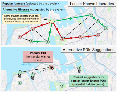 Le projet DiscoverPOIs (intitulé complet : Explainable Recommender System to Promote Lesser-Known POIs for Sustainable Tourism and Small Municipality Revitalization) est réalisé en collaboration avec le laboratoire MINE de l'Université de Kyushu (Fukuoka, Japon) et vise à développer un système de recommandation explicable qui identifie et promeut des points d’intérêt méconnus (Lesser-Known POIs - LKPs) pour favoriser un tourisme plus durable et contribuer à la revitalisation des petites municipalités. L’essor du surtourisme dans de nombreuses destinations entraîne une surfréquentation, des impacts environnementaux négatifs, une pression excessive sur les infrastructures locales et une détérioration de l’expérience des visiteurs. À l’inverse, de nombreux territoires moins connus, pourtant riches en patrimoine culturel, historique et naturel, restent sous-exploités, manquant ainsi des opportunités de développement économique. Plutôt que de considérer ces lieux uniquement comme des alternatives aux sites touristiques populaires (Well-Known POIs - WKPs), notre approche vise à les valoriser comme des destinations attractives à part entière. En exploitant des données hétérogènes issues de capteurs, de réseaux sociaux, d’Open Data et d’autres sources, le système proposera des itinéraires personnalisés combinant POIs connus et méconnus, optimisés en fonction des préférences des voyageurs, de leurs contraintes (temps, budget, accessibilité) et du contexte en temps réel (météo, saison, etc.). Contrairement aux approches existantes, qui souffrent souvent du {problème du démarrage à froid} (cold-start problem) et donc d’un biais en faveur des sites populaires, notre modèle introduira une méthode de génération d’itinéraires équilibrés} entre WKPs et LKPs. De plus, l’intégration de l’Intelligence Artificielle Explicable (XAI) permettra de justifier chaque recommandation, renforçant ainsi la confiance des utilisateurs et leur engagement. Enfin, le système ne se limite pas à la simple suggestion de lieux ; il inclura également des informations essentielles sur les coutumes locales, les réglementations et la sécurité} (notamment en cas de catastrophes naturelles), offrant ainsi une expérience plus immersive et respectueuse des communautés locales. Ce projet représente une avancée dans le domaine des systèmes de recommandation touristiques, en proposant une approche novatrice qui concilie personnalisation, durabilité et valorisation des territoires sous-exploités.